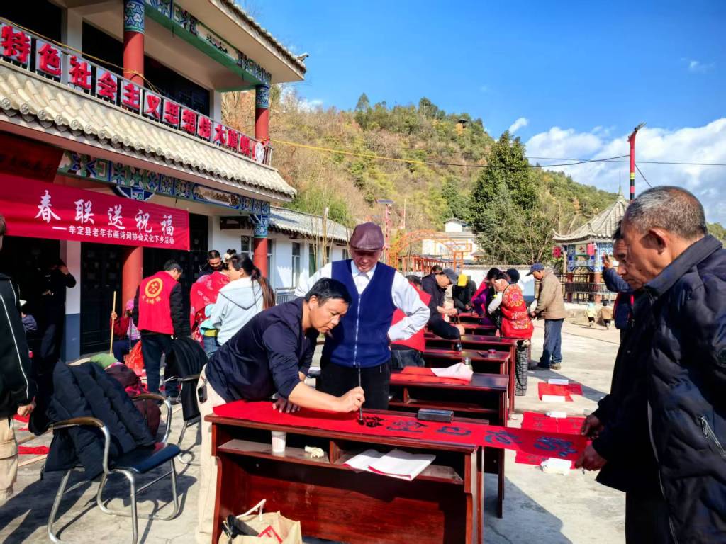 牟定县老年书画诗词协会的志愿者们来到蟠猫乡水冬瓜村开展“墨香暖牟定,春联送祝福”主题活动,义务为村民们书写对联,送上新春祝福。活动现场,红纸笔墨一应俱全,空气中都散发着淡淡的墨香,老年书画诗词协会的志愿者们全神贯注地在红纸上挥毫泼墨,一笔一画间,皆是对村民的祝福和对新春的期盼。笔墨流转间,一副副凝聚着志愿者们深情祝福的春联展示在人们面前,村民们对各位老师的书法赞不绝口,争相挑选自己心仪的春联,整个活动场地洋溢着欢乐喜庆的气氛。