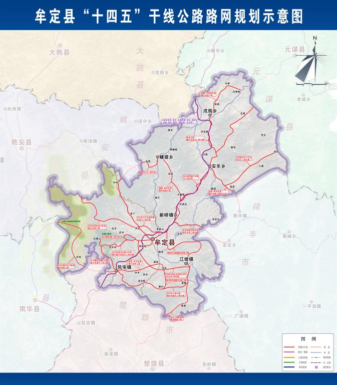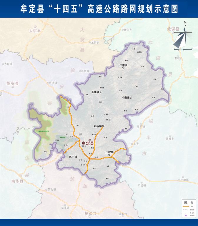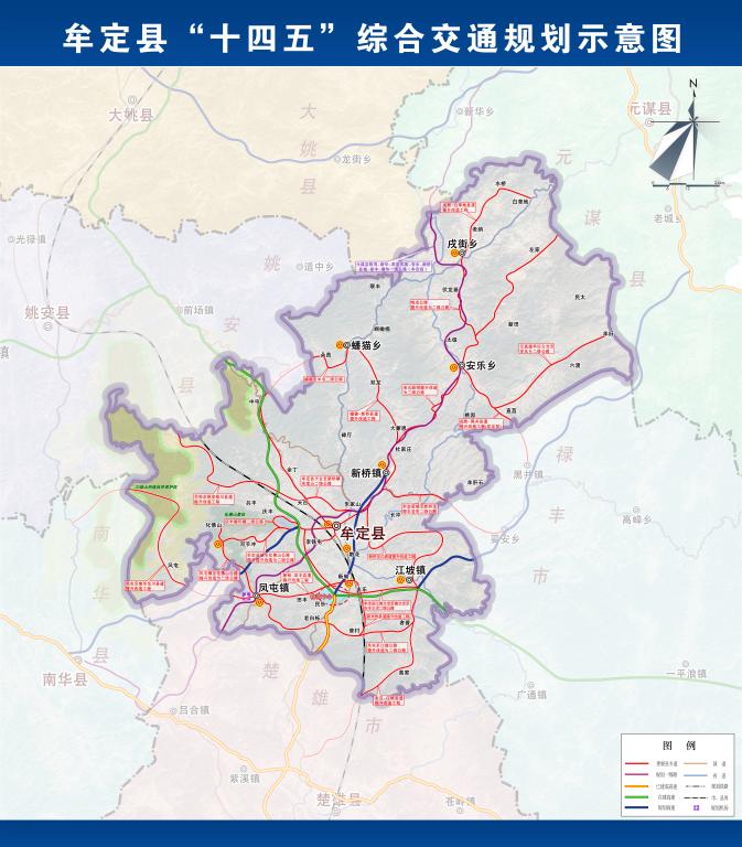 牟定县自身发展能力弱,迫切需要快速化的交通方式融入周边重点经济区。G5621昆楚大扩容建设稳步推进、S45楚姚高速公路建成通车,实现牟定高速公路的突破,将与楚雄市、禄丰、牟定、大姚、大理祥云形成高效运输通道,但与元谋、武定等地未实现高速公路通达,与省政府提出的县域高速“互联互通”的“十四五”规划目标存在较大差距。