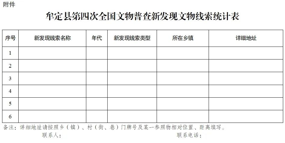 为方便信息核查,请您在提供线索时按照《牟定县第四次全国文物普查新发现文物线索统计表》要求,提供尽可能详细的情况描述,包括名称、年代、详细地址、照片等。