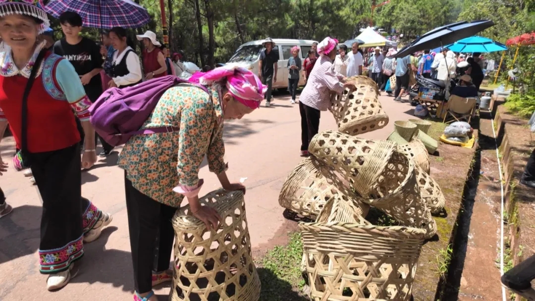 集市上,摊位沿着山路依次排开,各类商品琳琅满目,令人目不暇接。这边,圆润饱满的葡萄、红彤彤的苹果、细腻多汁的云南红梨,吸引着过往的人群驻足挑选;那边,摆放整齐的手工竹篮、精致的木雕摆件,展示着当地工匠们的精湛技艺,引得游客们纷纷询价购买。精美的彝族服饰也成为游客们驻足的打卡点。美食区弥漫着浓郁的香气,各种传统小吃应有尽有,刚出锅的油炸洋芋,放上调料香辣爽口;热气腾腾的粉蒸羊肉和羊汤锅,香飘四溢,成为当天集市上最畅销的美食。摊主们热情地招呼着顾客,食客们围坐在简易桌椅旁,一边品尝美食,一边欣赏彝家欢快的左脚舞,整个山间回荡着欢声笑语。“我每年都来赶这个立秋会,今年又换了一个地点到化佛彝村来赶这个秋会,到这个山林间逛集市,感觉空气相当好。”一名赶会的游客说。