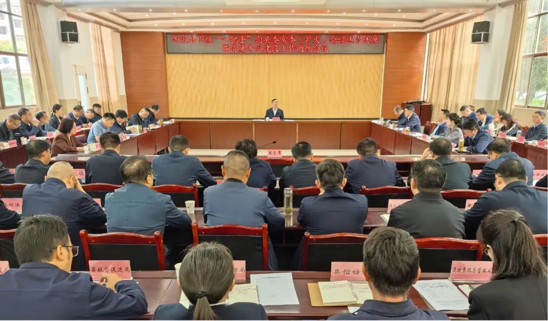 李明峰组织学习习近平总书记关于从严监督执纪的重要论述和重要指示批示精神;会议听取新桥镇、县发展改革局关于清廉建设工作情况;凤屯镇、安乐乡、县民政局、县人力资源和社会保障局、县自然资源局5家单位党委(党组)主要负责人现场述责述廉,县委常委进行现场提问,李明峰逐一点评,提出工作要求并作总结讲话。