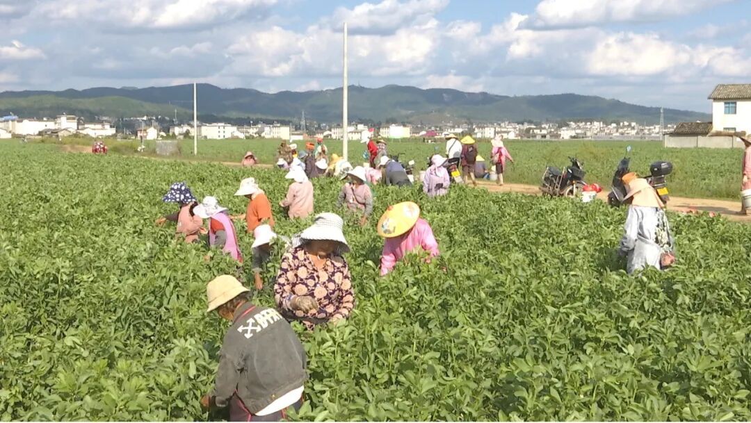 在共和镇天山村委会的1200亩大粒蚕豆种植基地里,连片的蚕豆田郁郁葱葱,饱满的豆荚挂满枝头。100多名务工群众正穿梭其间,熟练地采摘成熟的大粒蚕豆,田间地头一派繁忙的丰收景象。分拣车间内,工人们将新鲜采摘的蚕豆进行分拣、装袋,当天就通过冷链运输发往上海江桥批发市场。基地负责人桑安群介绍,这批大粒蚕豆于7月底种植,经过3个月的精心管理,10月份以来已经陆续采摘上市,每亩产量达到1.5吨左右,售价每公斤8到10元。“与上海江桥批发市场签订销售框架协议之后,由牟定县开展大粒蚕豆的田间抽检等日常监管,通过县农业农村局出示种植产地证明后,可以免检直接进入上海江桥批发市场,解决了种植户的后顾之忧,畅通了牟定到上海,从田间到餐桌的绿色通道。”县农业技术推广服务中心主任李金涛说。