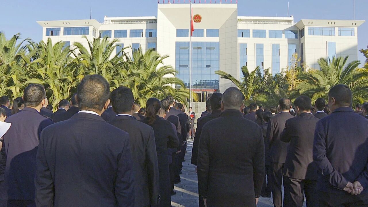上午9时,国旗护卫队入场,全体人员列队肃立,齐声奏唱中华人民共和国国歌。随后,全体人员面向国旗,进行宪法宣誓,以铿锵誓言表达尊法崇法的坚定信念。