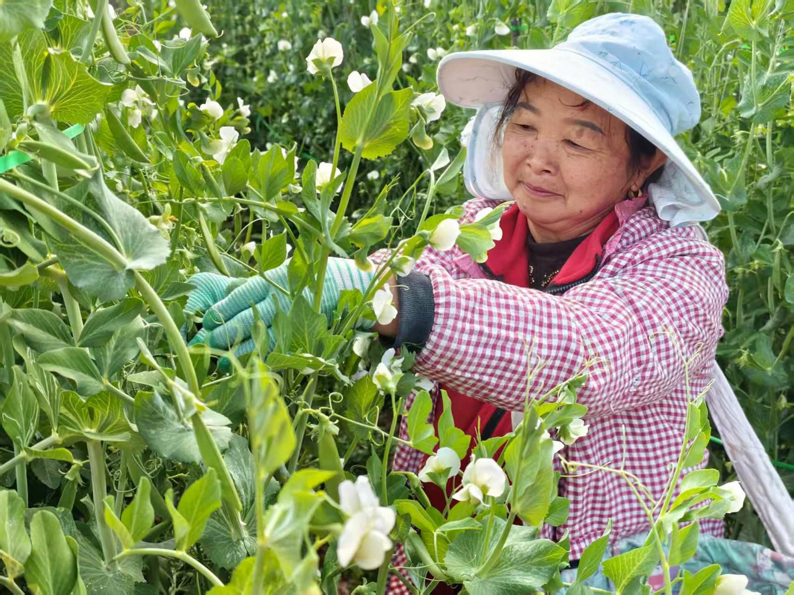 农户正在田间采摘荷兰豆