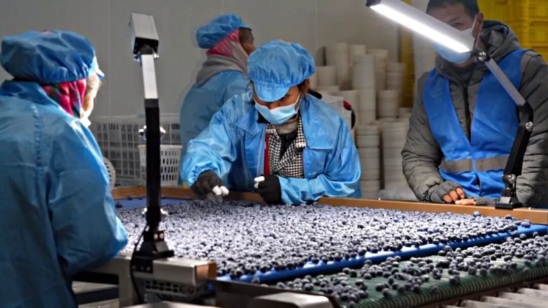 走进戌街乡碗厂村委会干海子村的600亩蓝莓种植基地,深紫色的蓝莓如宝石般点缀在翠绿枝叶间,果香四溢,务工群众穿梭其间,有条不紊地开展采摘、分拣作业,一派丰收繁忙的景象。