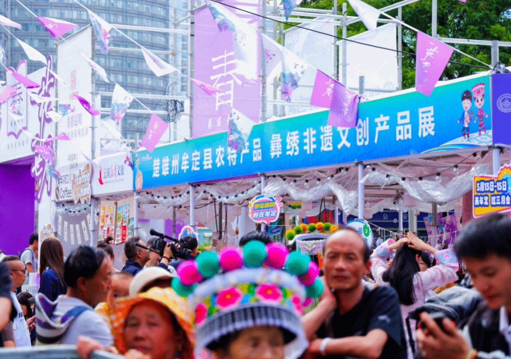 当天的南屏街广场仿佛一个小型牟定集市,牟定县农特产品、彝绣非遗文创产品展位一字排开,彝绣传承人现场展示针法,牟定腐乳开坛飘香,火腿、猪干巴切成薄片供人试吃,葛根系列产品、云香绿宝精油和护肤品也一一亮相。这些只是“先遣队”,更多牟定特色好物将在“三月会”期间集中展销。