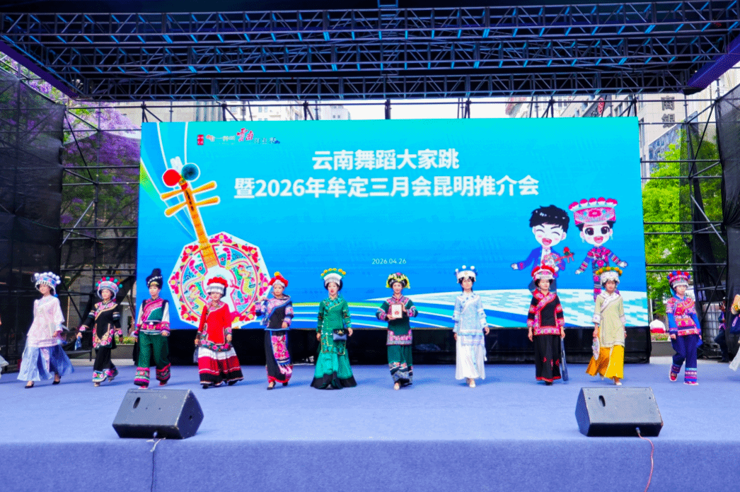 千年彝韵藏古今,一脚欢歌赴山海。4月26日,云南舞蹈大家跳暨2026年牟定“三月会”推介活动在昆明南屏步行街中心广场举行。这场提前赶起的“三月会”,把牟定的热情与诚意带到了春城街头。