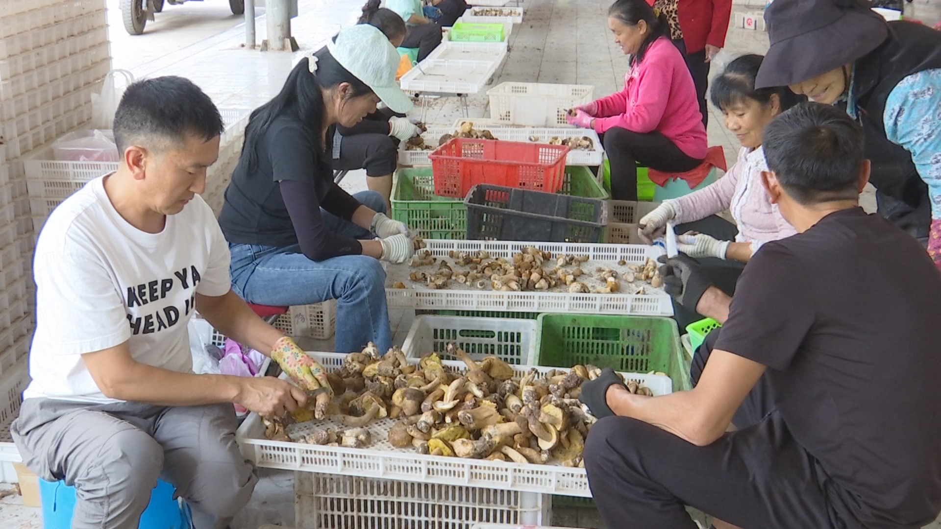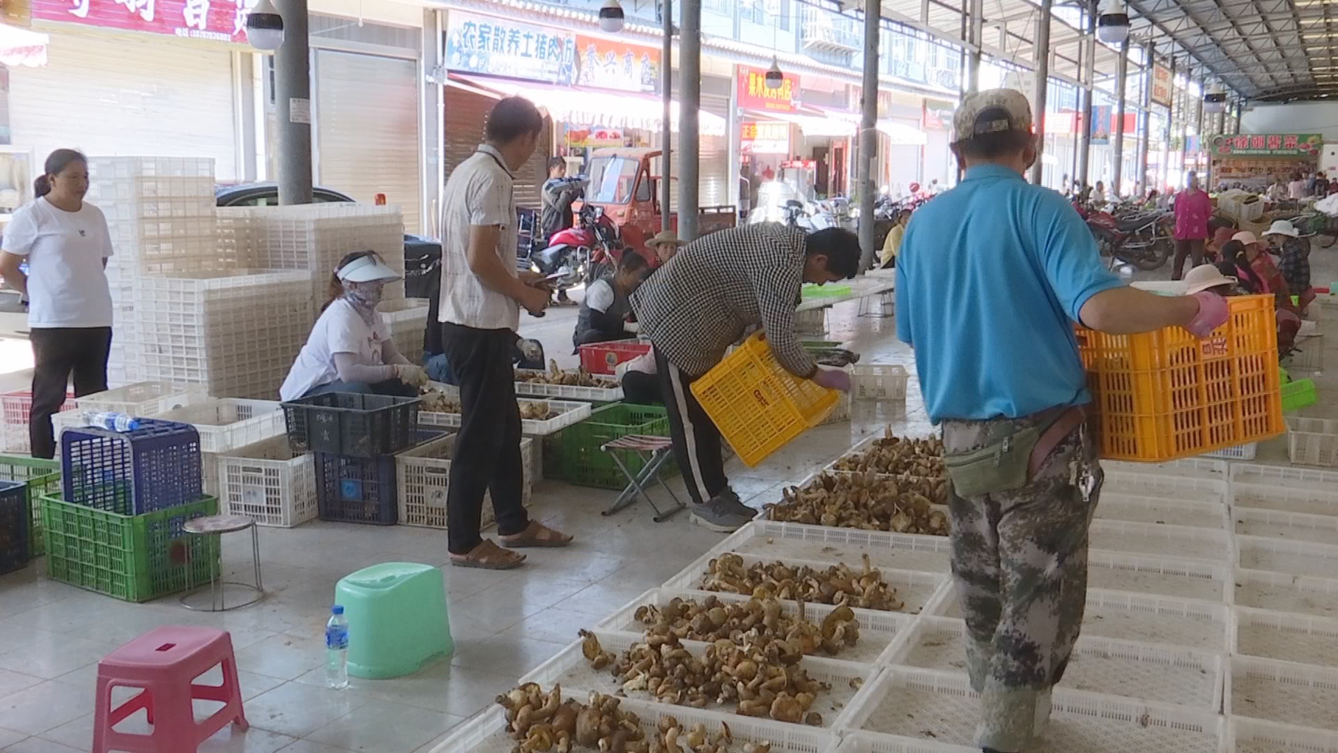 在牟定县福利来综合农贸市场野生菌收购加工点,可以看到20余名工人正在进行野生菌的分拣和菌杆表面的泥沙清理工作。在牟定像福利来这样的野生菌收购加工点共有三个,有效地为附近居民解决了就业增收问题。