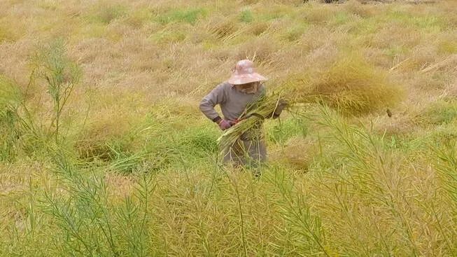 走进共和镇何梁村委会1000余亩云油杂15号油菜示范样板基地,连片的油菜田褪去了春日的绿美盛装,熟褐色的饱满荚果在秸秆上挤挤挨挨。李丽萍等几名村民正在用镰刀收割自家的油菜,身后一个个扇形的菜垛整齐摆布在田间,金灿灿的一片。“这个油菜长势太好了,产量比往年要高出二十多斤,我特别高兴。”李丽萍介绍,今年的油菜种子、肥料由牟定县农业农村局统一采购发放,并组织了飞防,村委会还协调了灌溉用水,田间管理也非常到位,她们不仅节省了成本,还提升了油菜产量。