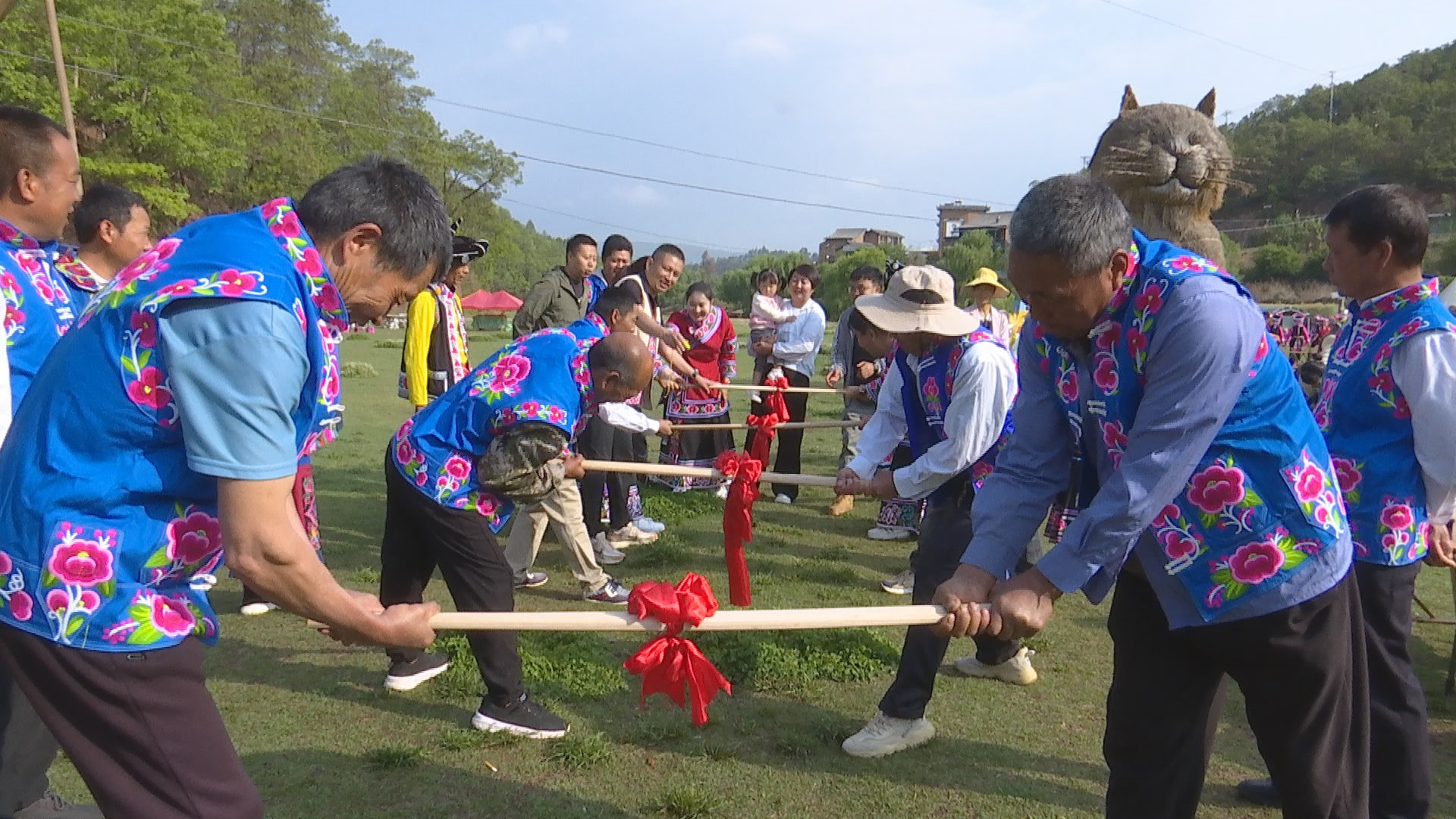 扭扁担民俗竞技活动也十分欢快热烈,只见多位壮汉正扎着马步,紧握扁担较劲。划拳的村民则围成一圈,响亮的喊着“五魁首啊、六六六”“八匹马啊、全来到”等吉利词,并且配上手势比划数字,现场不时爆发出阵阵哄笑声。