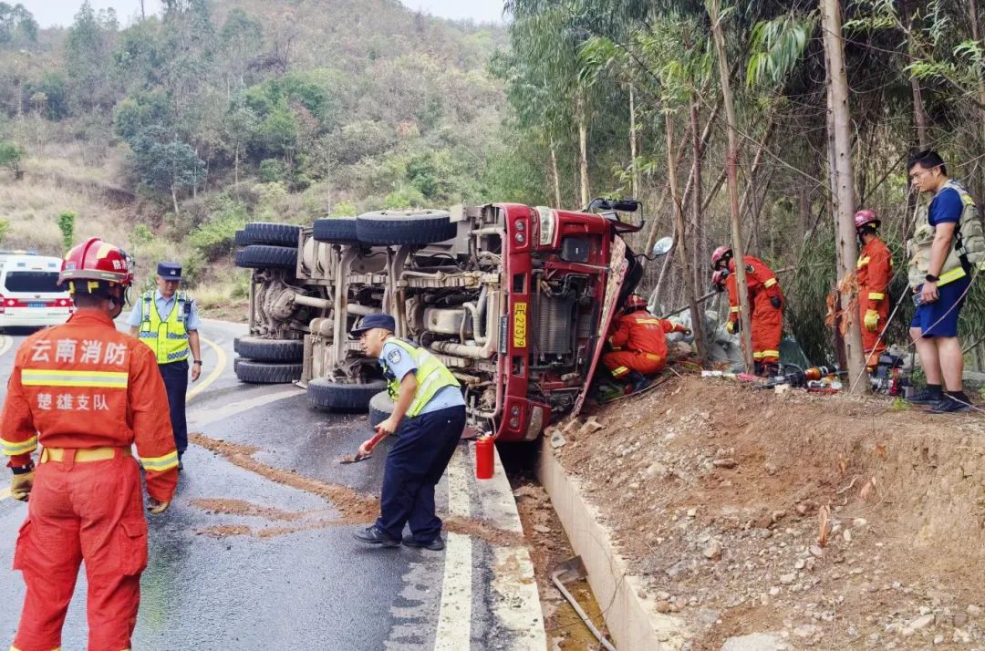 近日,牟定县公安局新桥派出所接群众报警称,在新桥镇杜家庄村路段,一货车因道路湿滑突然侧翻,驾驶员被困于驾驶座无法动弹并不停呼救,且车辆油箱处于漏油状态。接到报警后,民警立即赶赴现场,紧急关头,路过的热心群众自发加入救援行列。
