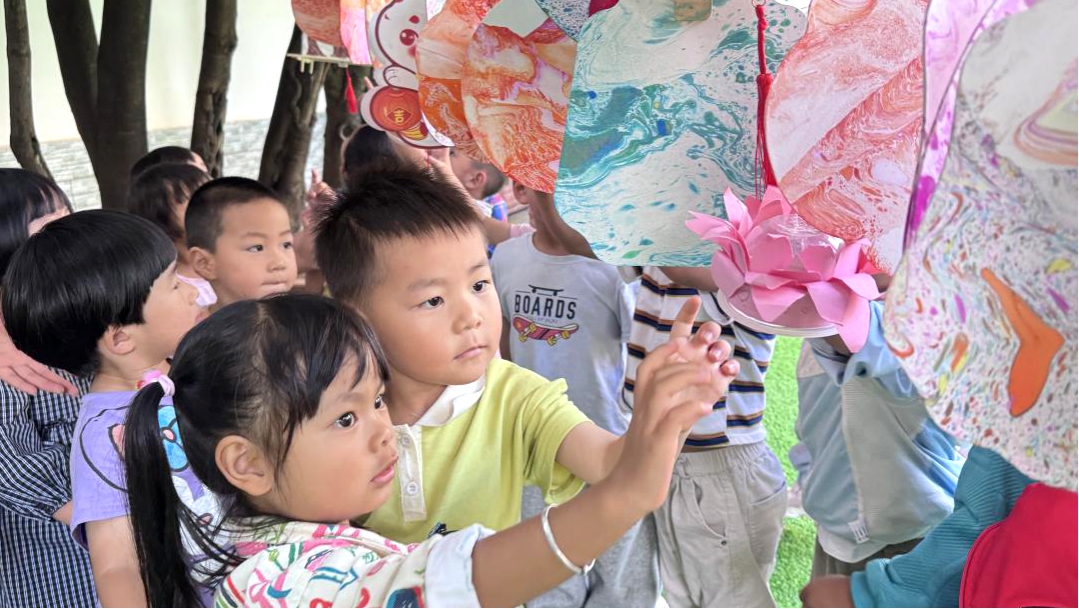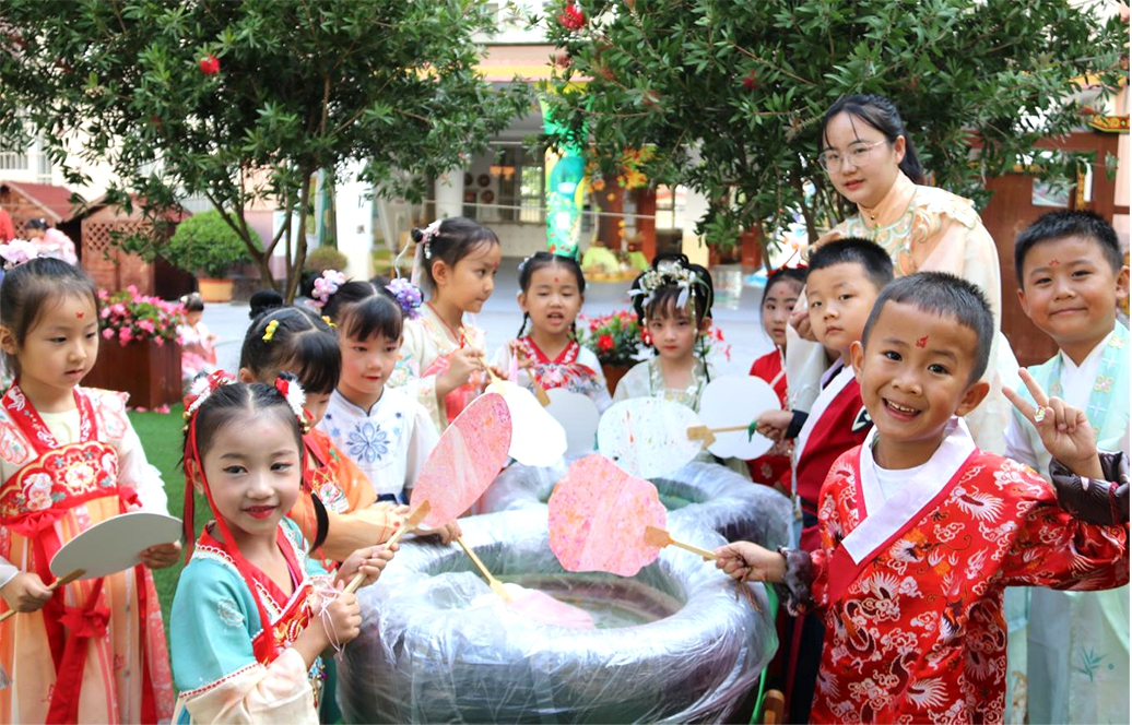 漆扇制作庆中秋。漆扇集绘画、书法等多种艺术于一体,不仅是传统手工艺品的代表,还是非物质文化遗产,承载着深厚的文化底蕴和精湛技艺。在老师的讲解、演示和指导下,从调配色漆到下扇染色,孩子们发挥创意,利用漆不溶于水的特性,通过“飘漆”技法,以漆为笔以水作画,一半人为、一半天成,一把把独一无二的古风漆扇呈现在眼前,孩子们脸上洋溢着自豪和满足,认知传统、继承传统、弘扬传统的种子在孩子们的心田种下。
