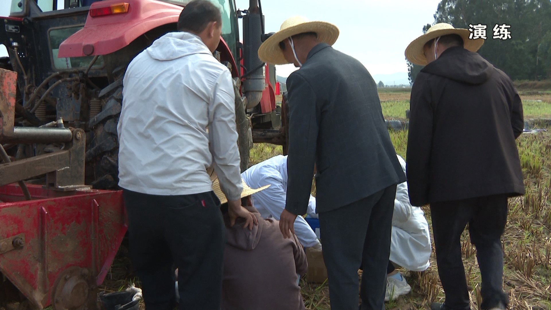 演练模拟犁田耙地专用拖拉机在田间作业时,因驾驶员注意力不集中造成农户小腿挂伤,事故发生后,驾驶员立即停止作业,下车查看伤者情况,田间劳作的其他群众拨打了120急救电话并向县农业综合行政执法大队报案。
