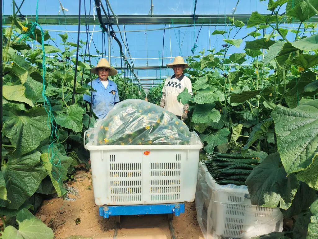 守着土地却赚不到钱是很多种地人的困惑,2024年9月,牟定县引进了有多年果蔬种植销售经验的河南客商万坦到牟定成立牟定鑫进唯果蔬种植有限公司发展果蔬种植。当年,公司就到江坡镇高平村委会的方屯、金窑两个村民小组流转土地300多亩开始种植黄瓜。“县上把我们招商引资过来,镇上、还有村上对我们的支持是相当大的,可以说是有求必应,路、水、电全部是给我们完善好的,对于这个营商环境我是非常的满意。”万坦说,当地党委政府和村委会在流转土地、用工及水电路等方面的给予协调和解决,让企业进得来、能发展。