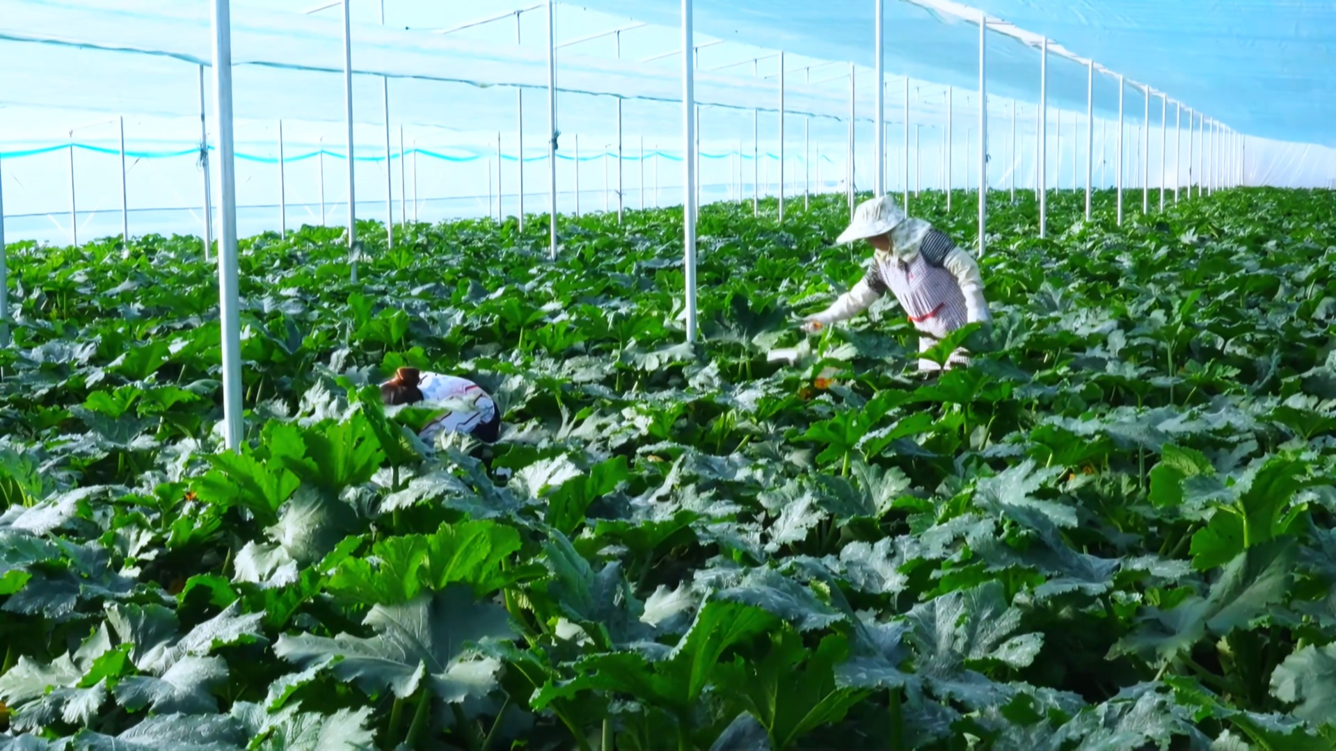 交售处热闹繁忙,种植大棚里同样也是生机勃勃。棚内瓜苗郁郁葱葱、西葫芦青翠欲滴,种植户们正忙碌在陇间采摘、劳作,绘成了一幅美丽的冬日农耕图。