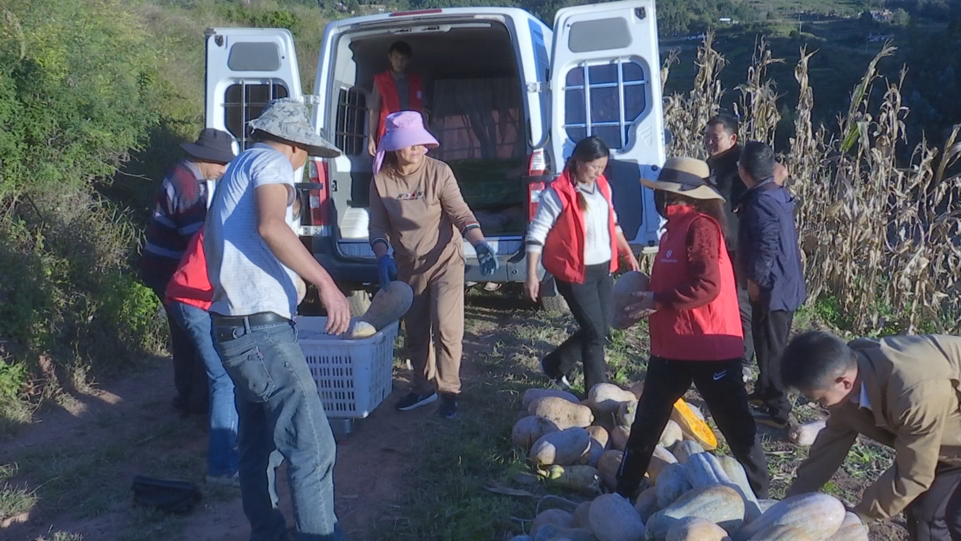 在交售蜜本南瓜的预定日,杨家文和格衣鲊村的脱贫户和监测对象一起,把摘好的蜜本南瓜运到路边,等待楚雄的批发商按质论价收购。品质好的每公斤在一块钱或者一块钱以上。