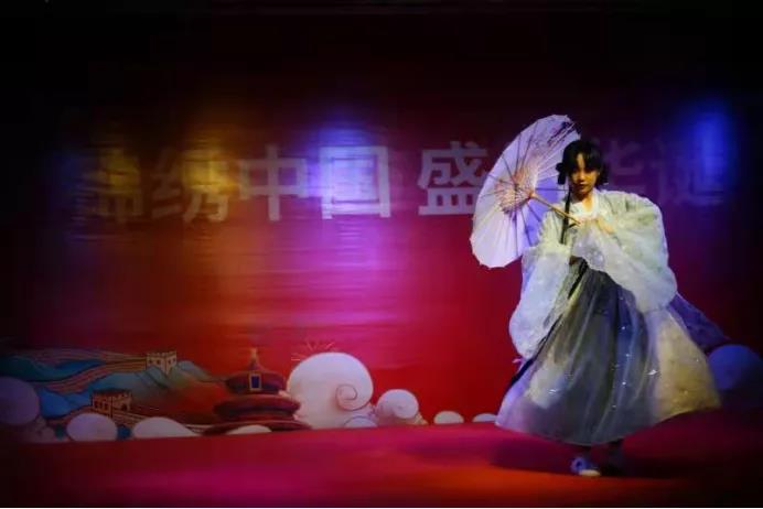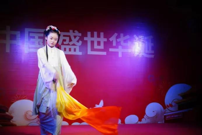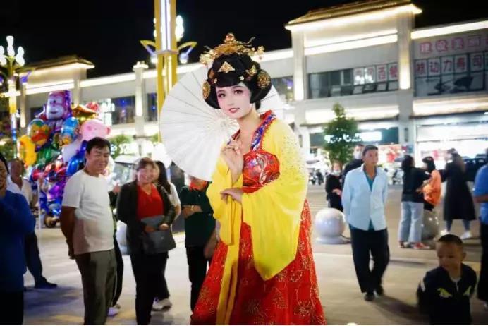 节日里的古镇可真热闹,广场上挤满了人,一场汉服走秀正在上演。台下也是光彩照人,大唐不夜城里的不倒翁小姐姐也来了呢!她高高的站在那里,高髻华服,一手持小扇,一手持小伞,摇来晃去,摆出各种造型,真是又美又骄傲。