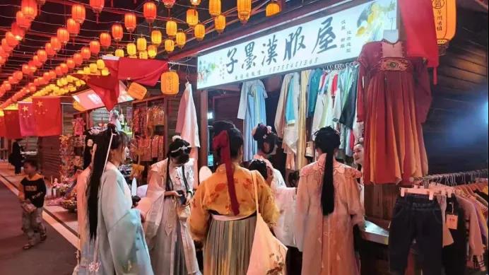 喜欢汉服的人可真不少。子墨汉服店前挤满身穿汉服的姑娘,看一屋子的汉服,摆弄着小饰品。店主温情又好看,忙着帮别人梳头插花。若非街上不时有行人经过,似乎已经穿越回汉唐了。