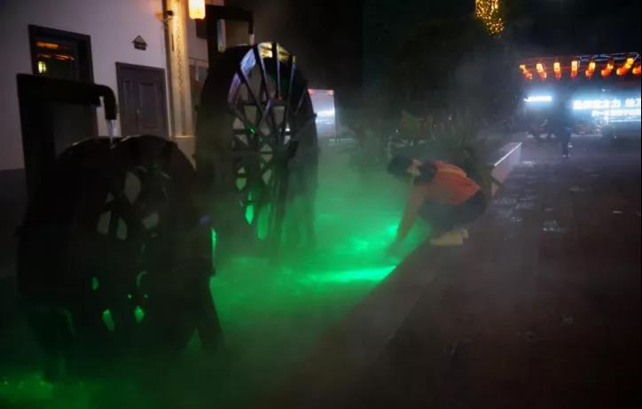 隐约中有歌声传来,踏进一片迷蒙水雾,歌声就在不远处。河道在小路中间穿流,水中两轮仿古水车缓缓转动,狭长的河道向外噗噗喷着水雾,小路雾气蒙蒙,绿野仙踪。