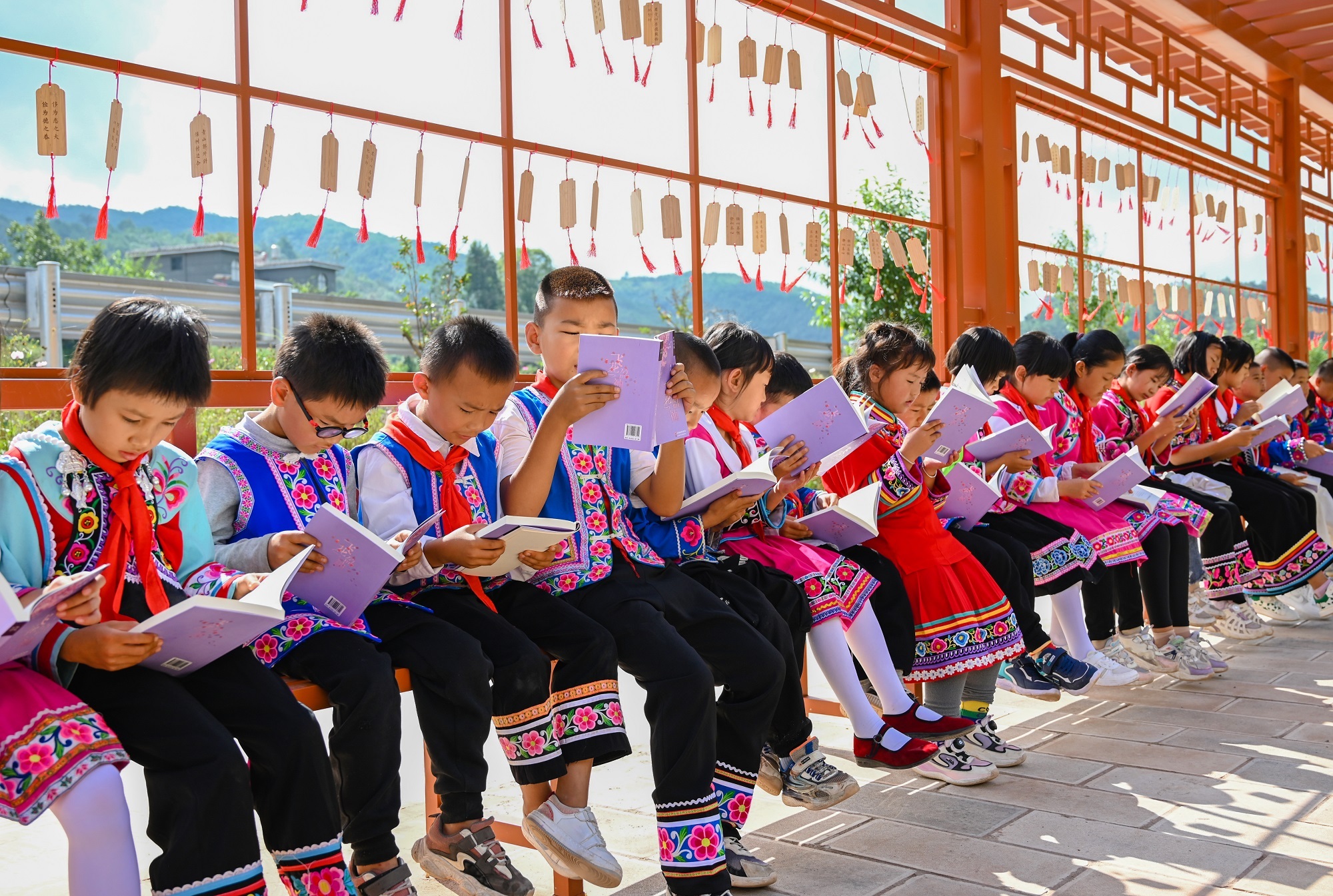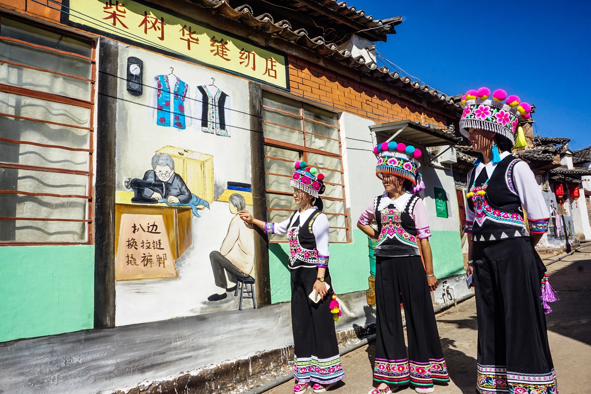 再往下走,就到了大古岩村——蟠猫乡人民政府所在地。这里是彝族文化的聚集地,文化室里陈列着的绣花衣裳、绣花鞋、彝家农具等关于彝族文化的物品,整个村庄成了一个彝族文化展示厅。