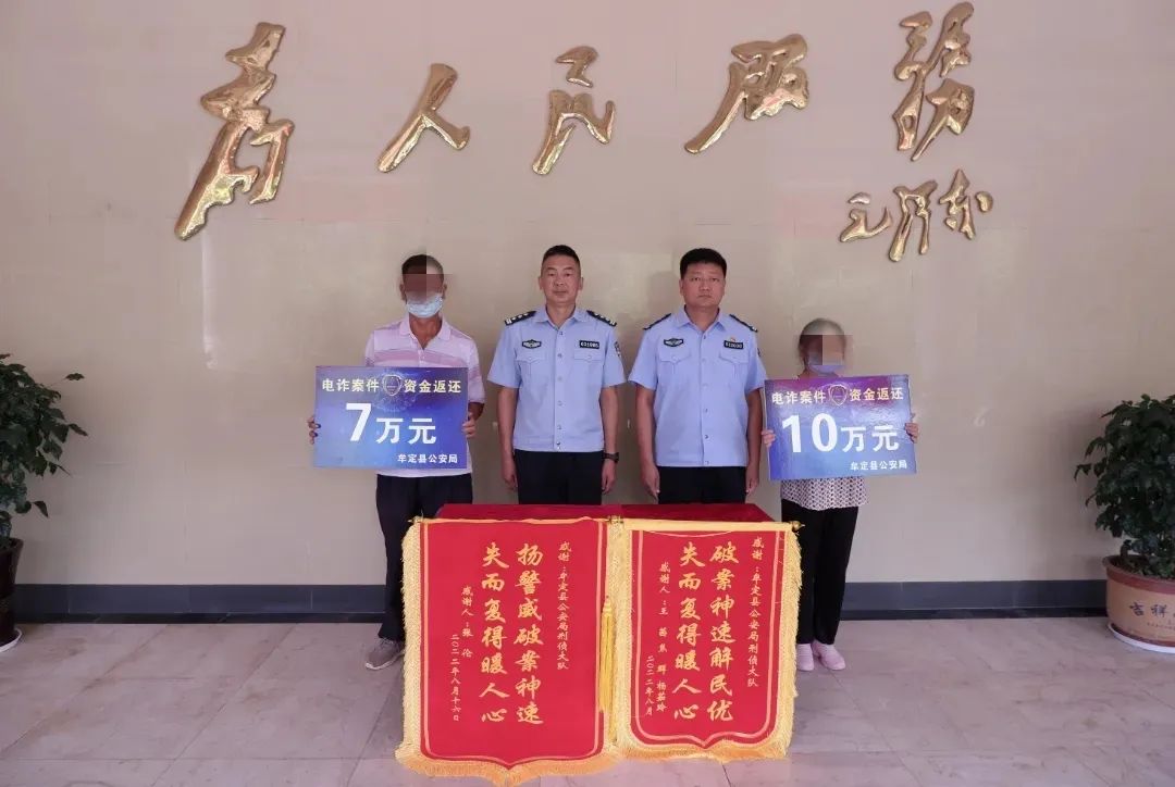 2022年8月16日下午,被骗群众张某、王某手持“ 破案神速解民忧,失而复得暖人心”的红色锦旗来到了牟定县公安局,看着他们被骗的17万元现金失而复得,笑声和掌声传遍了公安局的整幢大楼。