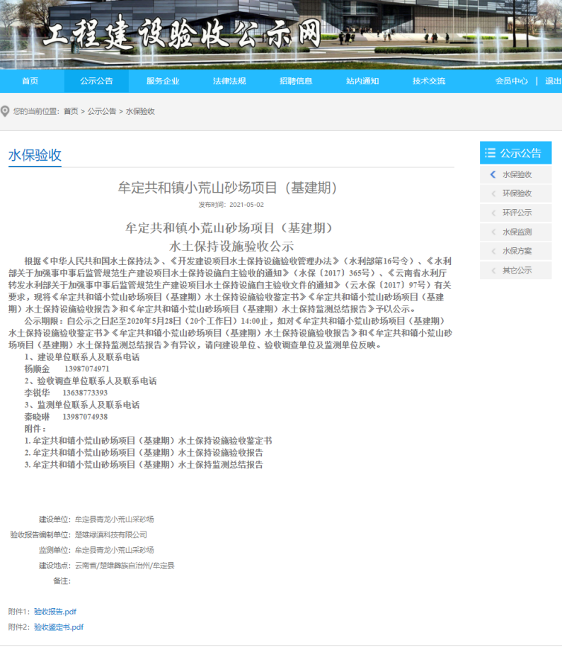 公示期限:自公示之日起至2020年5月28日(20个工作日)14:00止,如对《牟定共和镇小荒山砂场项目(基建期)水土保持设施验收鉴定书》《牟定共和镇小荒山砂场项目(基建期)水土保持设施验收报告》和《牟定共和镇小荒山砂场项目(基建期)水土保持监测总结报告》有异议,请向建设单位、验收调查单位及监测单位反映。