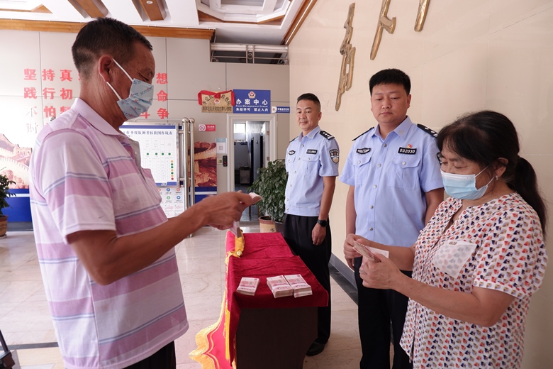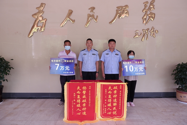 为感激牟定县公安局破案神速,及时为群众追回被骗损失,2022年8月16日下午,云南牟定XX生物科技有限公司王X和牟定县江坡镇甘海资村被骗群众张X亲自给刑侦大队送来“ 破案神速解民忧,失而复得暖人心”的红色锦旗,这个看似十分普通和平常的举动却道出了辖区老百姓的心声。“太感谢了,骗子的手法再怎么伪装都逃不过你们警察的法眼,都怪我和出纳不小心,轻信公司年检而误向骗子汇款,以后再也不会了”“犯罪分子胆子真大,竟然盗用我们江坡镇党委书记的头像,冒充领导加我微信,并对我实施诈骗,这让我防不胜防,多亏有了你们,及时挽回了我三年的血汗钱!”张X一边点头敬礼一边向主办侦查员递来了锦旗。接过17万元现金的瞬间,掌声再次响起。这是本月来牟定县公安局的第三起退赃活动。