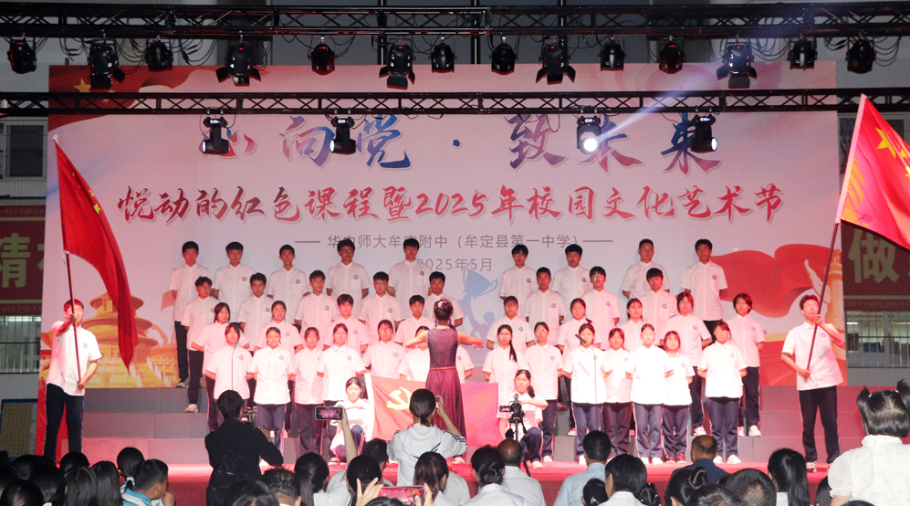 当舞台灯光照亮“红旗飘飘”的巨幅背景,一场艺术赋能的“大美思政课”拉开帷幕。近日,华中师大牟定附中在学校通达广场举办《心向党·致未来》——悦动的红色课程暨2025年校园文化艺术节,由师生们自编自导自演,融合歌舞、音乐、情景剧、多媒体等多元艺术形式的视觉盛宴正在上演,精彩的课堂点燃了全场,师生们被生动鲜活的表演深深感染。初一、初二、高一、高二全体学生和全体教师近2000人共赴这场红色思政主题盛宴。