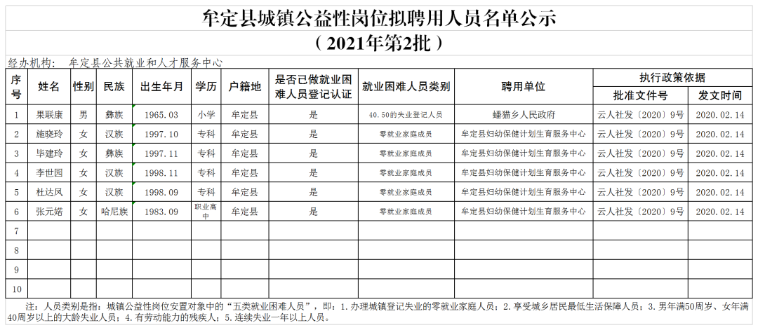 附:牟定县城镇公益性岗位拟聘用人员名单公示(2021年第2批)