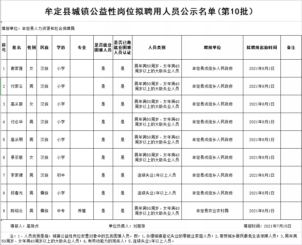 附:牟定县城镇公益性岗位拟聘用人员名单公示(2021年第10批)