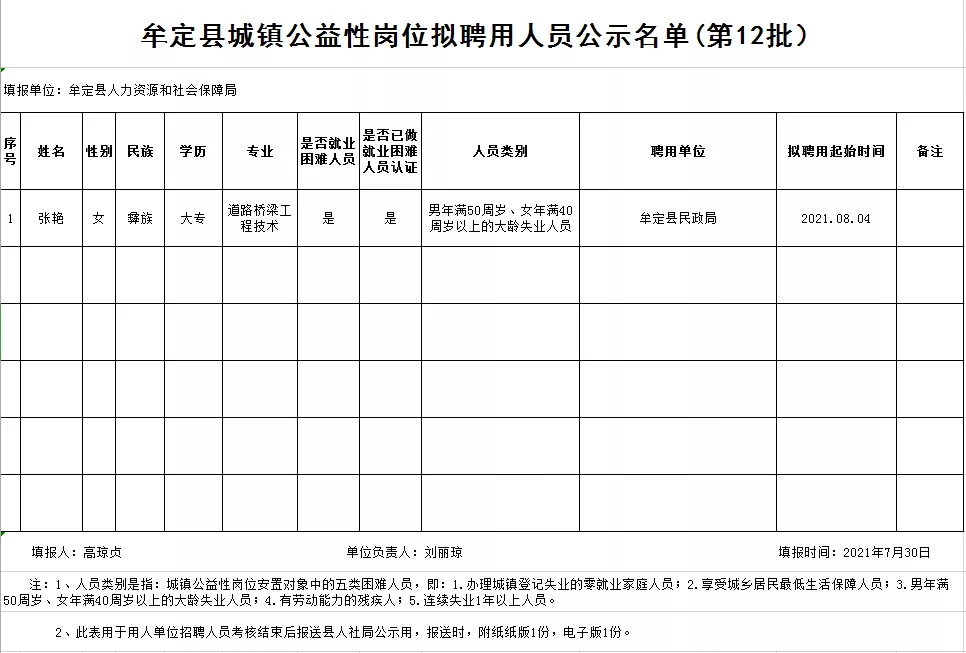 附:牟定县城镇公益性岗位拟聘用人员名单公示(2021年第12批)