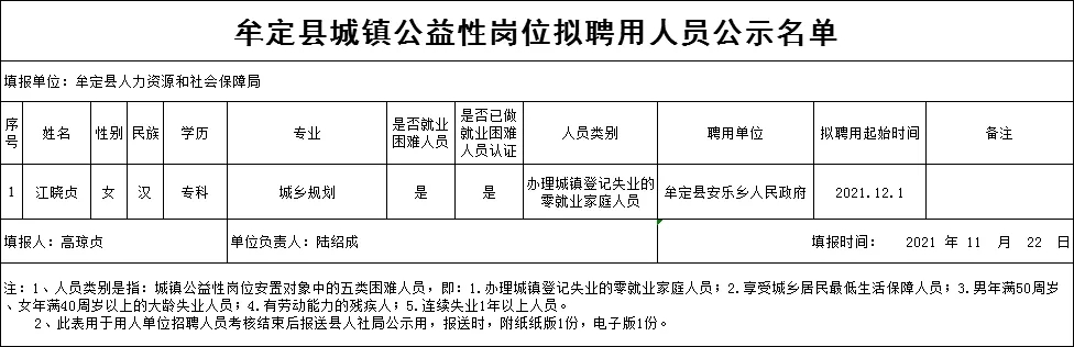 附:牟定县城镇公益性岗位拟聘用人员名单公示(2021年第18批)