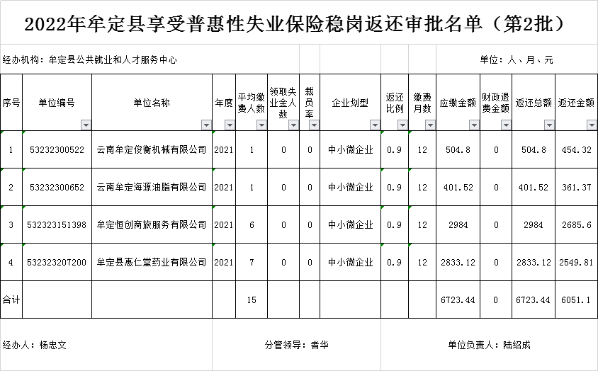 根据《云南省人力资源和社会保障厅关于做好2022年失业保险稳岗返还预发放工作的通知》文件规定,经初审,云南牟定俊衡机械有限公司、云南牟定海源油脂有限公司、牟定恒创商旅服务有限公司、牟定县惠仁堂药业有限公司4户参保单位符合规定的稳岗返还规定条件(详见附表),现予以公示5个工作日(法定节假日除外),公示期为:2022年6月14日至2022年6月21日,公示期间如对公示单位有异议的,请在公示期内通过电话、传真、邮件等方式与牟定县人力资源和社会保障局公共就业和人才服务中心联系或反映。