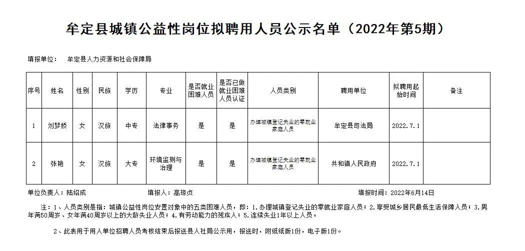 附:牟定县城镇公益性岗位拟聘用人员名单公示(2022年第5期)