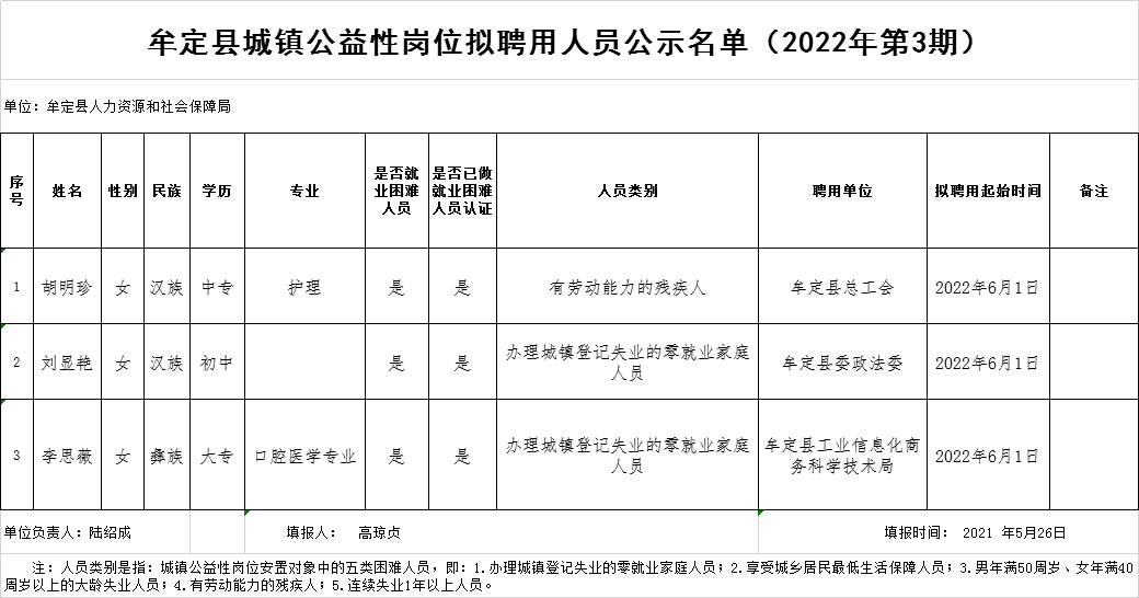 附:牟定县城镇公益性岗位拟聘用人员名单公示(2022年第3期)