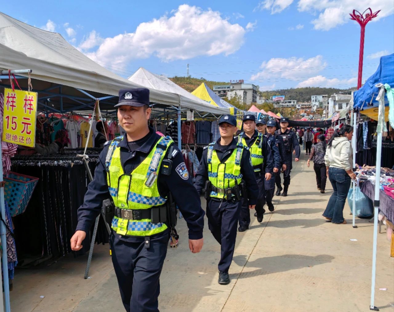 戌街集镇中心村各条街道物资商品琳琅满目,文化广场上龙狮表演、花灯剧、左脚舞等文艺演出活动相继上演,针对现场活动多、人流量大的特点,参与执勤的警力坚守在各执勤点位,全力做好现场秩序维护、巡逻防控、交通疏导等各项安保工作,确保活动安全有序进行。