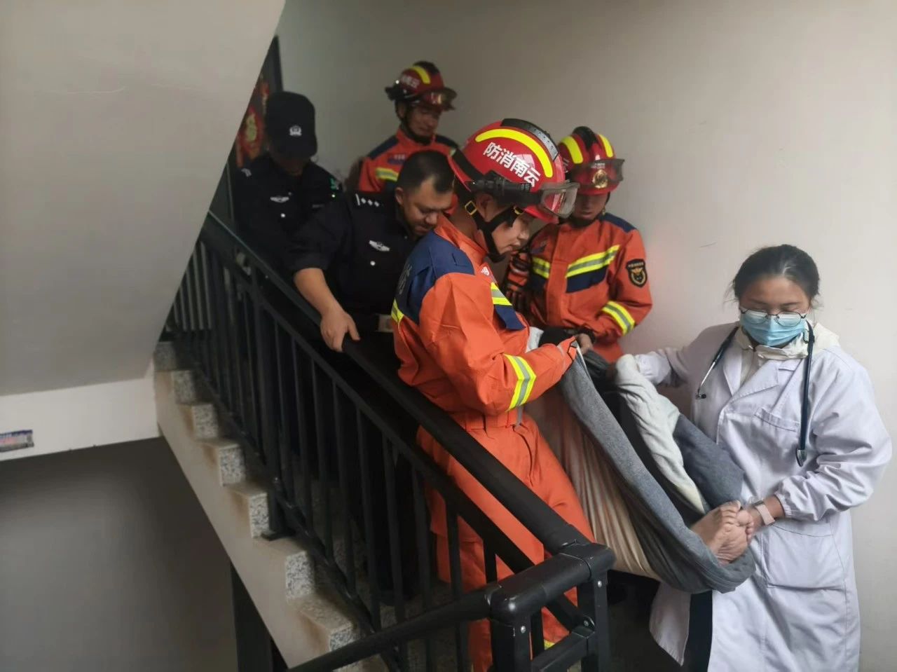 消防人员凭借专业技能与丰富经验,紧张有序操作,迅速打开房门。与此同时,120急救人员及时赶到,立刻对老人展开初步检查和急救。经诊断,老人脑梗发作,情况危急。民警与医护人员紧密配合,小心将老人抬上担架、送上救护车,一路疾驰送往医院进一步救治。
