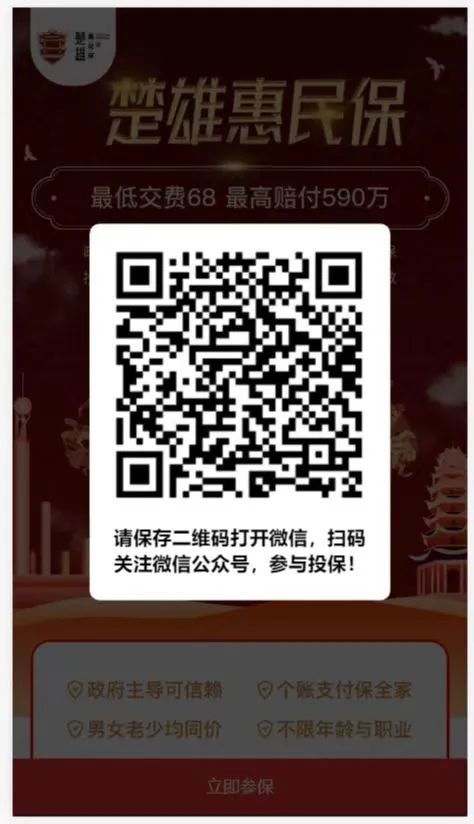 “楚雄惠民保”由楚雄州人民政府主导,楚雄州医疗保障局、楚雄银保监分局共同推动,中国人寿保险股份有限公司楚雄分公司等六家保险公司共同承保。该保险产品以普惠价格为楚雄州基本医疗保险参保人提供百万级保险保障和便民化健康服务,大力提升楚雄人民的健康保障水平,大幅减轻参保人医疗费用负担。