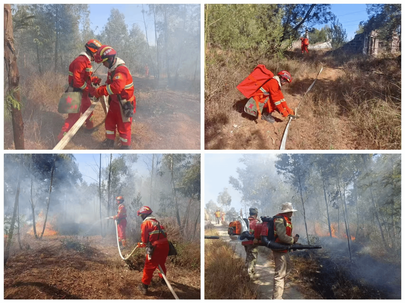 镇专职消防队率先抵达现场,迅速展开火情侦察,判断火势蔓延趋势后,立即制定“先控制、后消灭”的扑救策略。队员们熟练操作风力灭火机、高压水泵等装备,对明火进行集中扑救;村级扑火队默契配合,手持灭火拖把、铁锹等工具,清理地表余火和暗火,防止复燃;邀请县林火监测中心主任张松现场指导扑火战术,确保灭火作业科学安全;派出所民警维护现场秩序,疏散周边群众;卫生院医护人员搭建临时救护点,随时准备应对突发伤情。