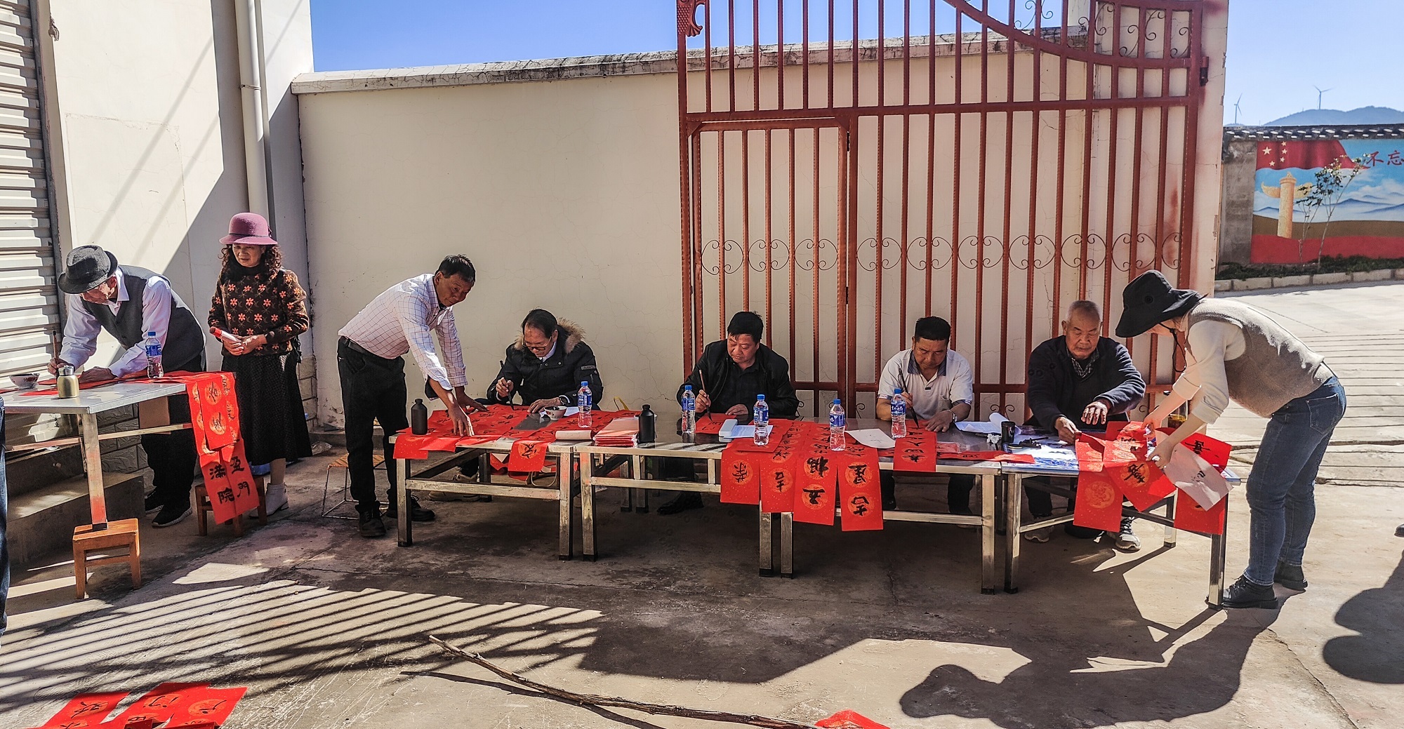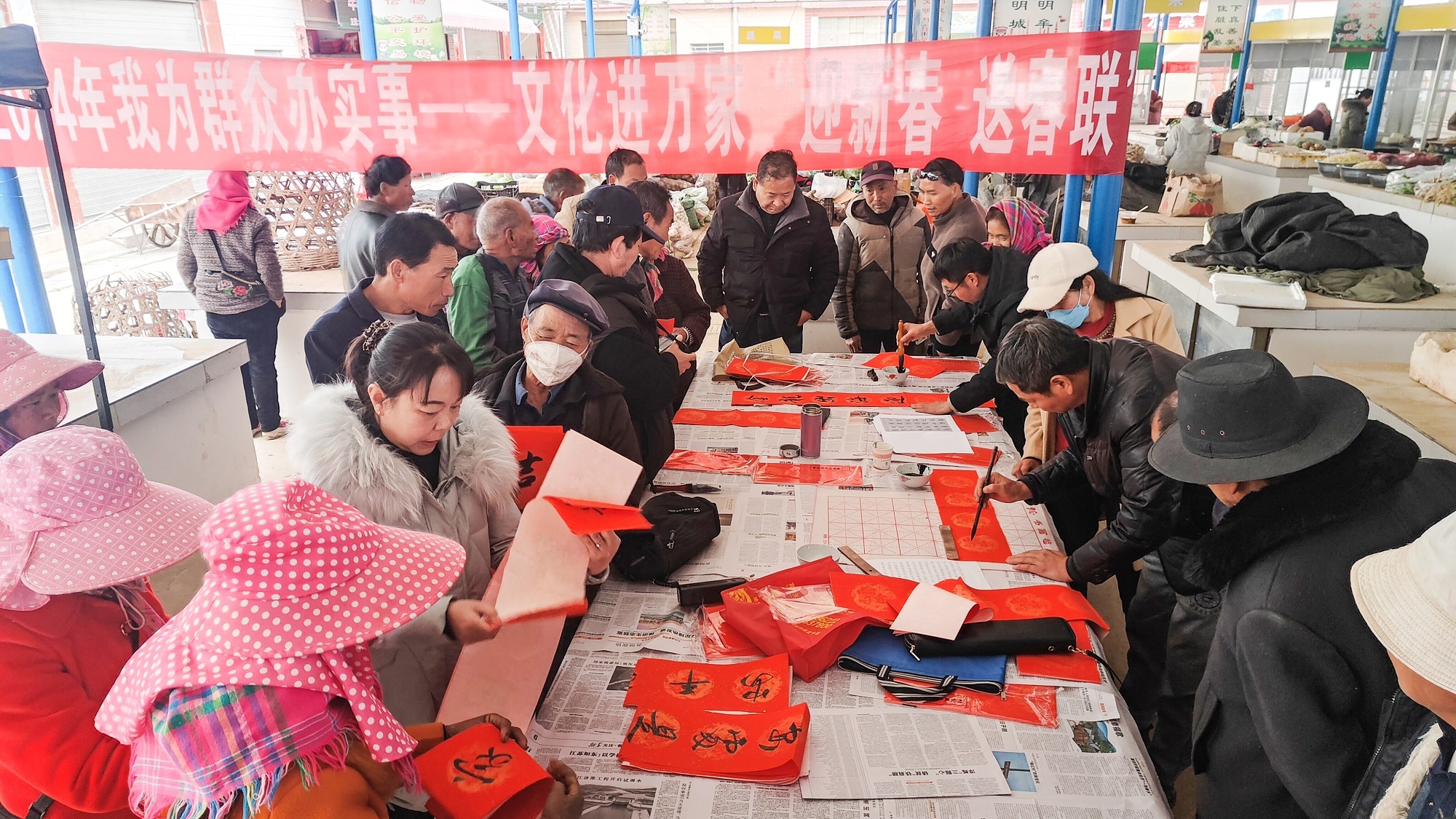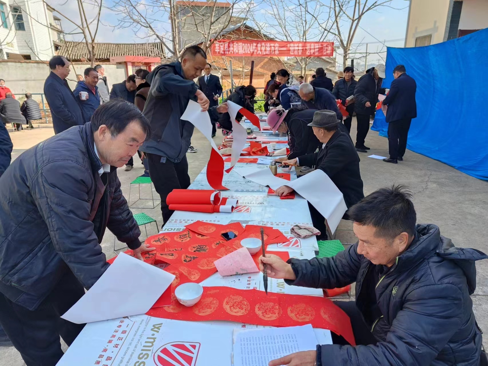 春节临近,云南省楚雄彝族自治州牟定县组织书画爱好者深入乡村,积极开展“牟定县2024年我为群众办实事——文化进万家迎新春送春联”活动,掀起送春联、送祝福的热潮,深受城乡群众欢迎和好评。图为牟定县书法家协会会员到安乐乡猫街集镇为群众义务书写春联。