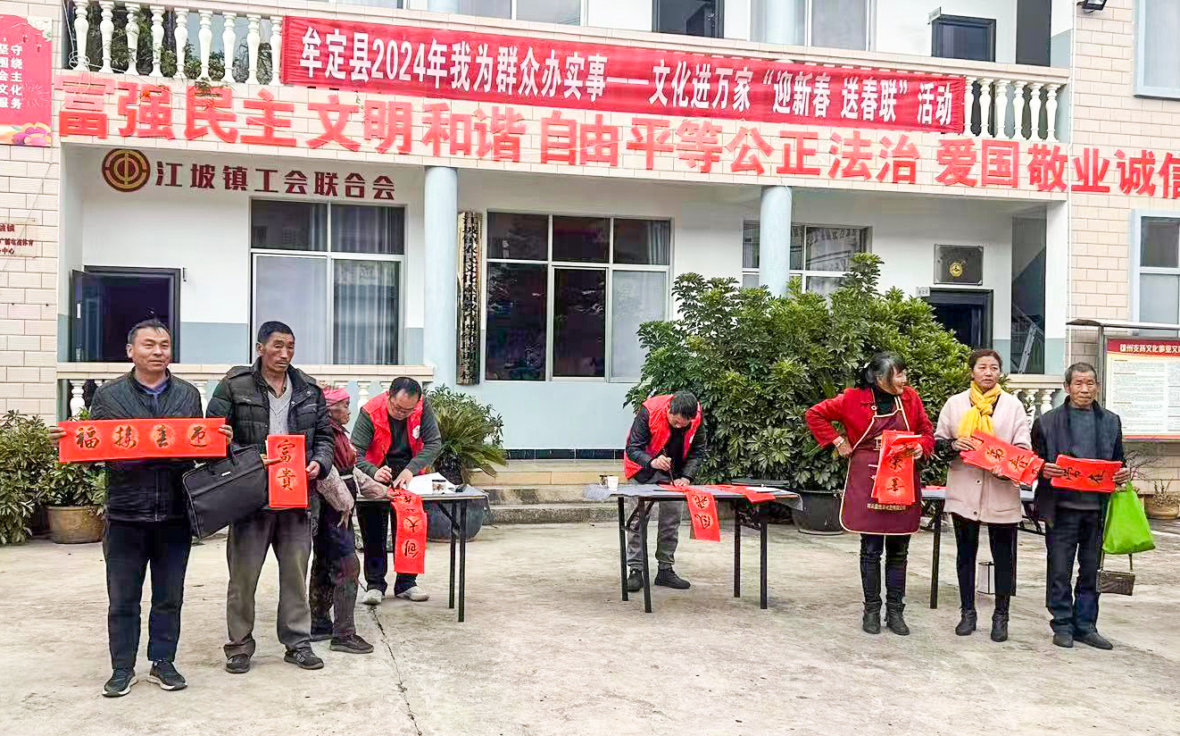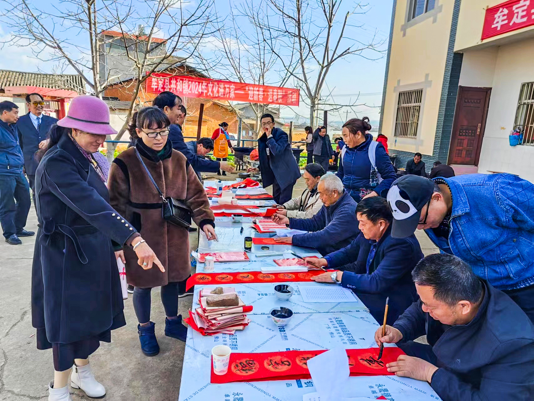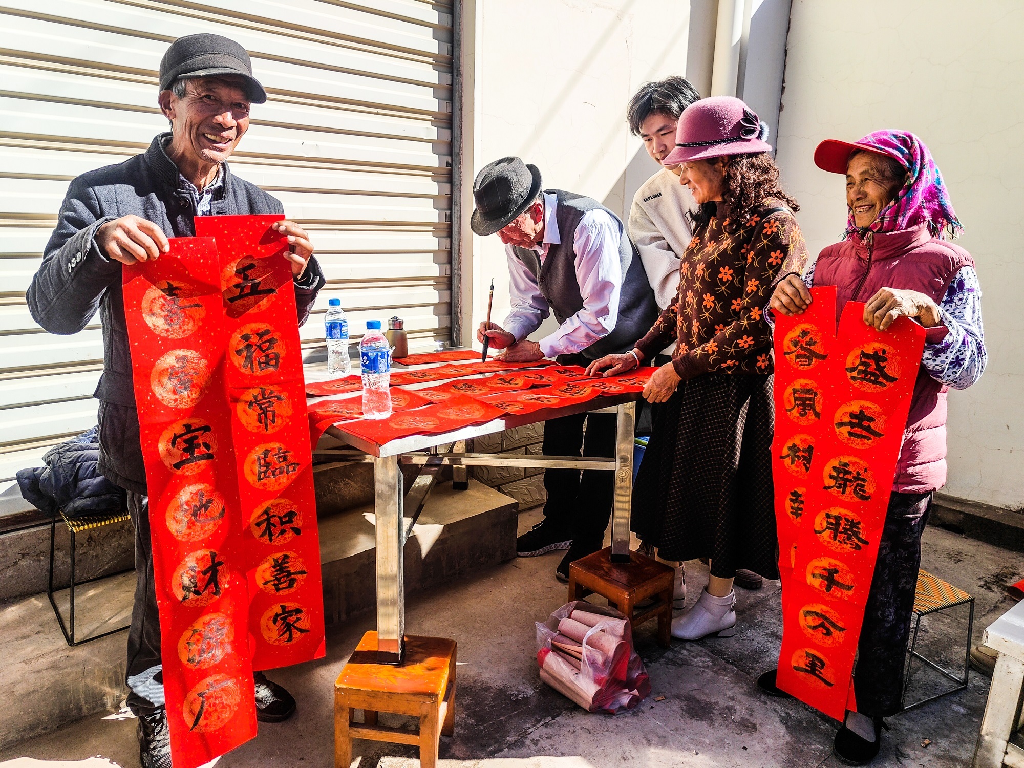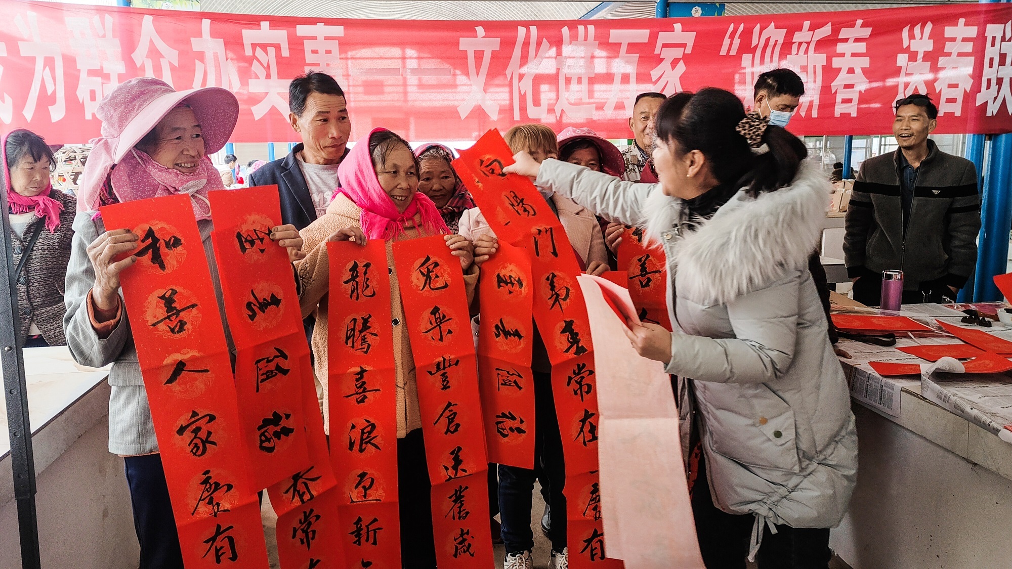 春节临近,云南省楚雄彝族自治州牟定县组织书画爱好者深入乡村,积极开展“牟定县2024年我为群众办实事——文化进万家迎新春送春联”活动,掀起送春联、送祝福的热潮,深受城乡群众欢迎和好评。图为牟定县书法家协会会员到安乐乡猫街集镇为群众义务书写春联。