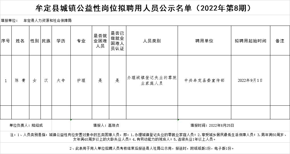 附:牟定县城镇公益性岗位拟聘用人员名单公示(2022年第8批)