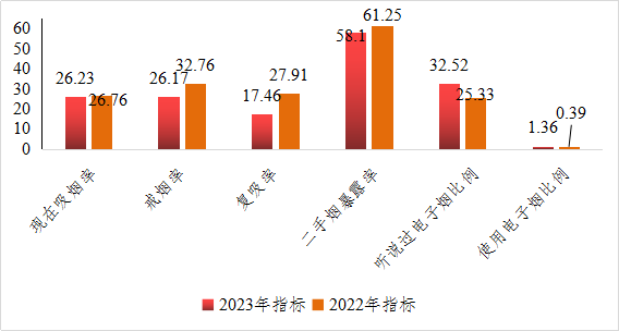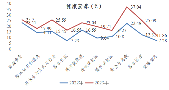 2023年我县城乡居民健康素养水平较2022年比较,健康素养水平上升了2.59个百分点;三个方面健康素养水平与2022年比较,基本知识和理念素养水平下降3.58个百分点,健康生活方式与行为素养水平高10.14个百分点,基本技能素养水平高9.32个百分点。