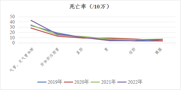 2.死亡情况:牟定县2022年粗死亡率为1049.94/10万(标化死亡率为705.72/10万),其中男性为1144.58/10万(标化死亡率为817.76/10万)、女性949.18/10万(标化死亡率为587.49/10万)。死因顺位依次为心脏病、脑血管病、呼吸系统疾病、恶性肿瘤和伤害共占死亡总数的87.69%。人均期望寿命为75.7岁,其中男性72.78岁,女性79.11岁,女性较男性高6.33岁。四类慢病(心脑血管疾病、恶性肿瘤、糖尿病和慢性呼吸系统疾病)早死概率为18.72%,其中心脑血管疾病9.25%,恶性肿瘤7.59%,糖尿病0.97%,慢性呼吸系统疾病2.12%。