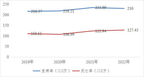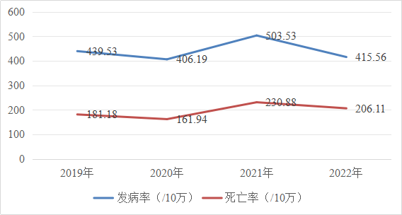 目前,心脑血管疾病、肿瘤、糖尿病和慢性呼吸系统疾病为主的慢性非传染性疾病(简称“慢性病”)已成为威胁人类健康的主要疾病,成为人类最大的杀手。我国居民慢性病死亡占总死亡人数的比例高达86.6%,造成的疾病负担已占总疾病负担的70%以上,已成为影响国家经济社会发展的重大公共卫生问题。牟定县2022年死因顺位前五位依次为心脏病、脑血管病、呼吸系统疾病、恶性肿瘤和伤害,这五类死因引起的死亡人数占总死亡人数的87.69%;2022年报告肿瘤发病率为230.1/10万,比2019年报告肿瘤发病率205.02/10万上升12.23%;报告急性心脑血管事件发病率为415.56/10万,比2019年报告脑卒中发病率439.53/10万下降5.45%;2022年牟定县居民慢性病与营养监测显示:18岁以上居民高血压患病率为38.29%,糖尿病患病率为13.04%,超重率24.99%,肥胖率6.85%。大量研究证实,慢性病的发生与不良行为和生活方式密切相关,包括吸烟、过量饮酒、不合理膳食,身体活动缺乏及精神因素等。同时,WHO相关研究表明,慢性病并非是不可防控的,大约80%的心脏病、脑卒中和2型糖尿病以及1/3的癌症都可以通过消除共同的危险因素来预防,因此慢性病危险因素的有效防控是预防慢性病发生的必要措施。