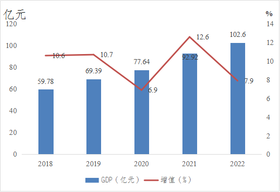 2022年全县生产总值(GDP)总量102.6亿元,比上年增长7.9%。其中:第一产业增加值22.3亿元,增长5.1%;第二产业增加值47.3亿元,增长11.9%;第三产业增加值33亿元,增长4.8%。