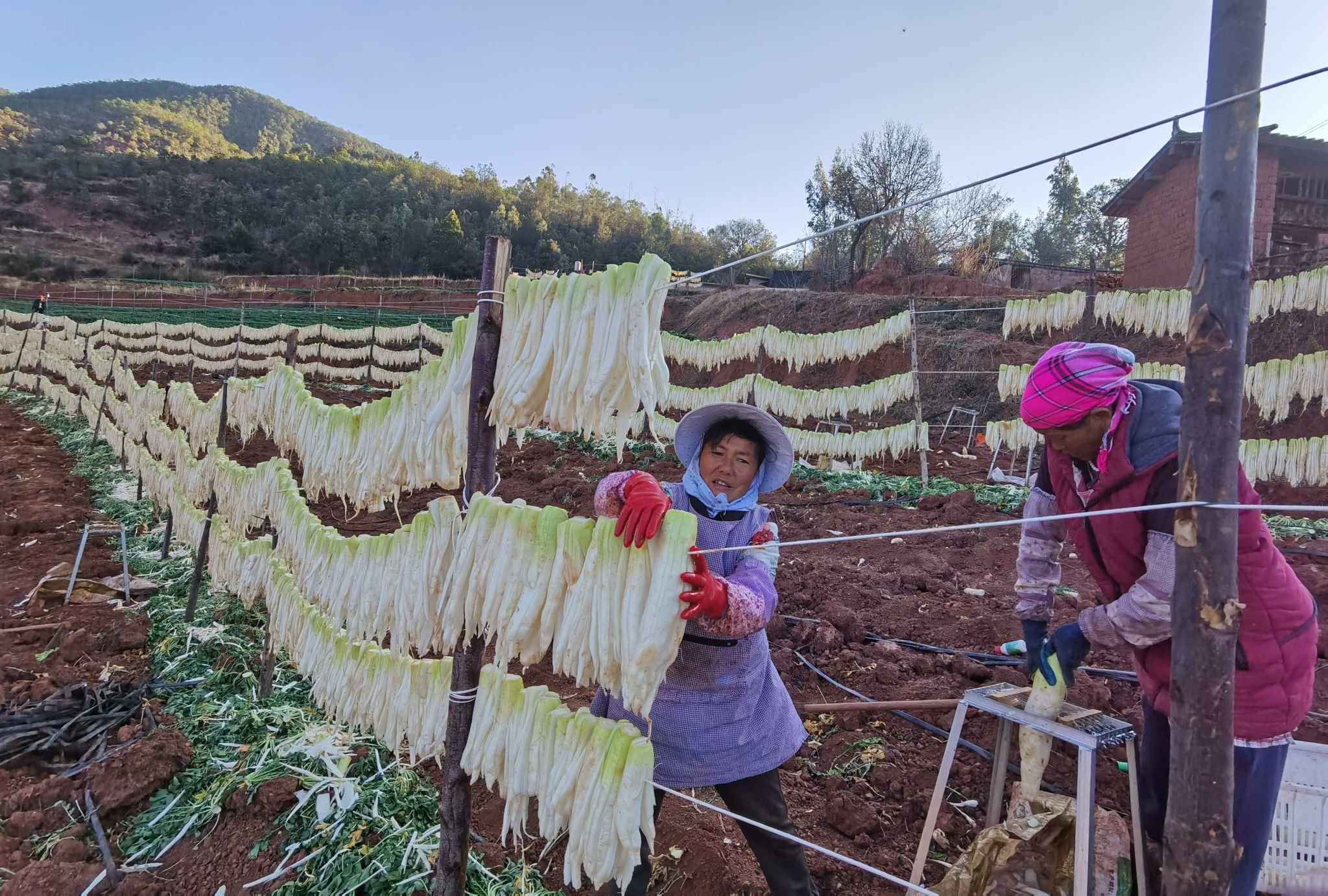 深化技术赋能,提升产业发展“硬实力”。为实现帮萝卜种植户提质量、增效益的目标,蟠猫乡积极与楚雄洪保农副产品开发有限公司建立合作,重点引入“韩白大根”优质高产萝卜品种,采取“烟田套种”“玉米田套种”“翻耕尽种”等方式进行种植。由企业技术人员和乡农业农村发展服务中心工作人员组成农技服务队,按照“包村联户”制度,深入村组、逐户走访种植农户,常态化开展技术指导服务,切实解决农技推广“最后一公里”问题。2025年以来,开展萝卜种植技术培训6次,各村开展“田间微课堂”20余场,累计培训农户700余人次。同时,积极搭建专家工作站,依托省农科院专家和农技人员推广试种新品种萝卜,大力培养“土专家”“田秀才”,推动萝卜品质跃升。