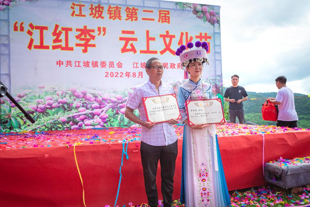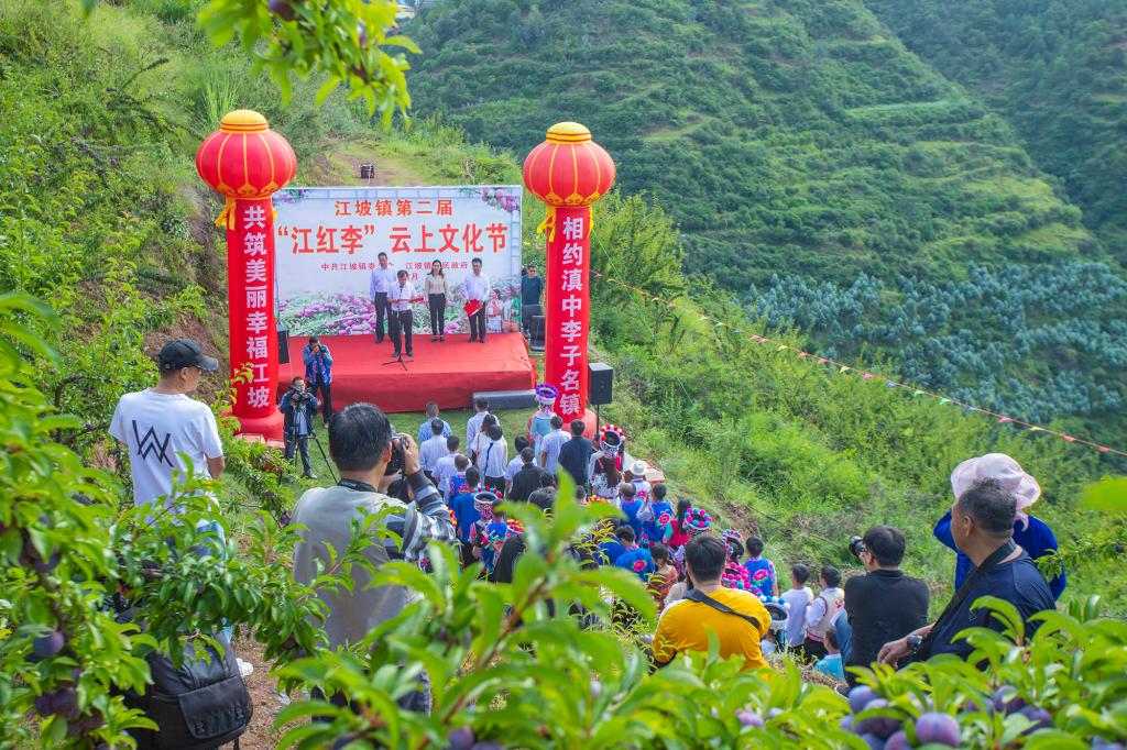 【江坡简讯】8月8日上午,江坡镇成功举办以“相约滇中李子小镇,共筑美丽幸福江坡”为主题的牟定县江坡镇第二届“江红李”云上文化节,活动邀请电子商务公司、鲜果销售公司、果脯加企业、种植技术服务公司等参加开园采摘活动,全面推介江坡镇特色产品及优势资源,通过本土龙头企业、电商、网红直播带货等线上线下销售,促成3个项目在江坡镇第二届“江红李”云上文化节成功签约,签约总投资额达2.55万元。活动通过抖音、微信、快手等平台进行宣传,当日浏览量达50余万人次。2022年,江坡镇7000亩“江红李”挂果形成产量面积1600亩,预计产量可达500吨,实现产值200万余元。