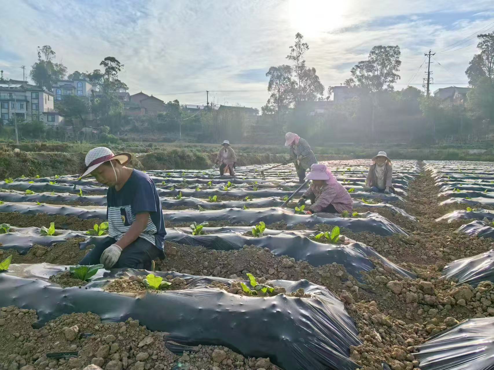 走进高平村烤烟种植基地,只见拉农家肥的车子在机耕路上来回奔忙,整齐排列的覆膜烟地里,三五成群的烟农们正紧锣密鼓地对刚移栽不久的烟苗进行掏苗、施肥、浇水,现场还有技术人员在对烟农进行指导,田间呈现出一派热火朝天的农耕景象。