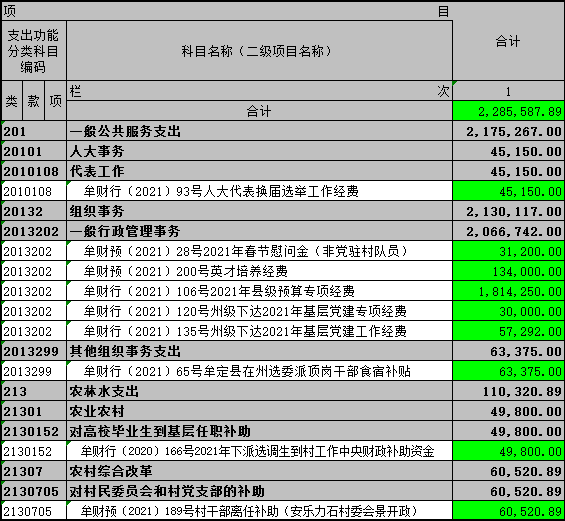 12.农林水(类)支出11.03万元,占一般公共预算财政拨款总支出的1.66%。主要用于对高校毕业生到基层任职补助和对村民委员会和村党支部的补助;
